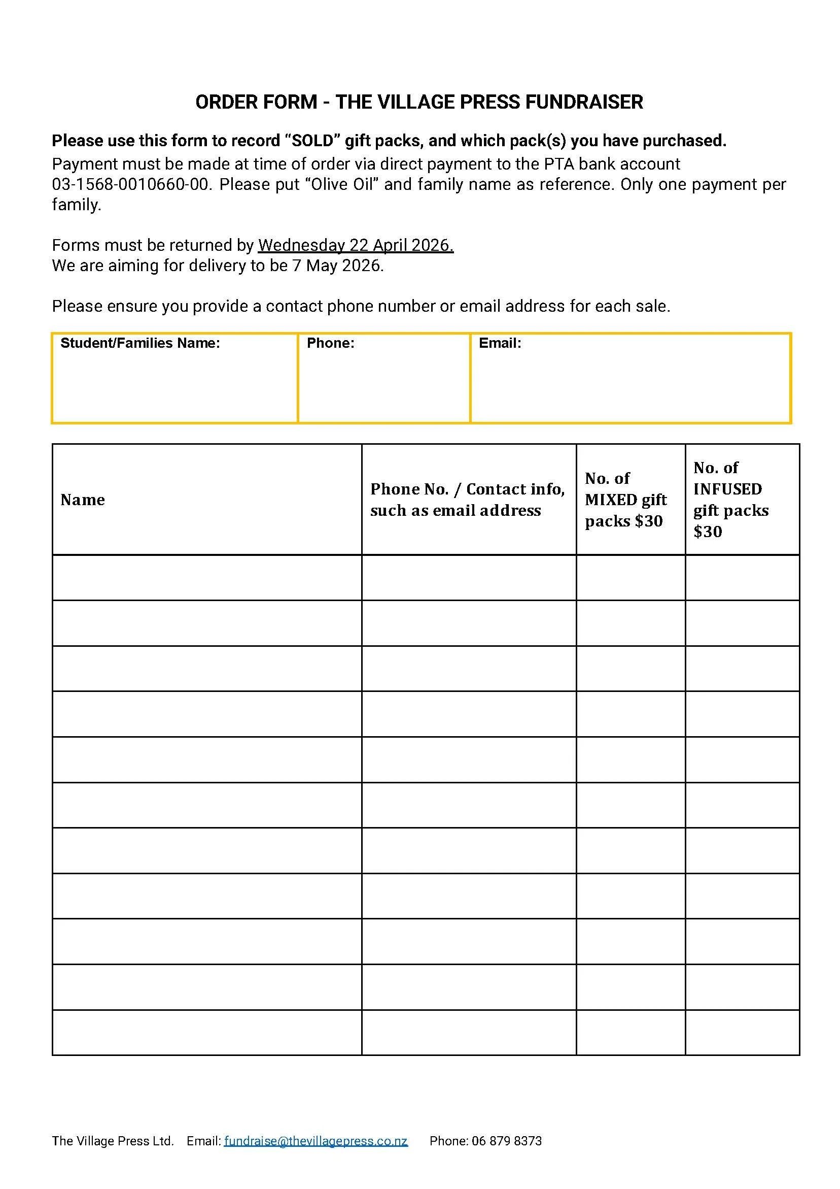 Olive Oil gift packs available Now. Forms to be returned by 22 April 2026.