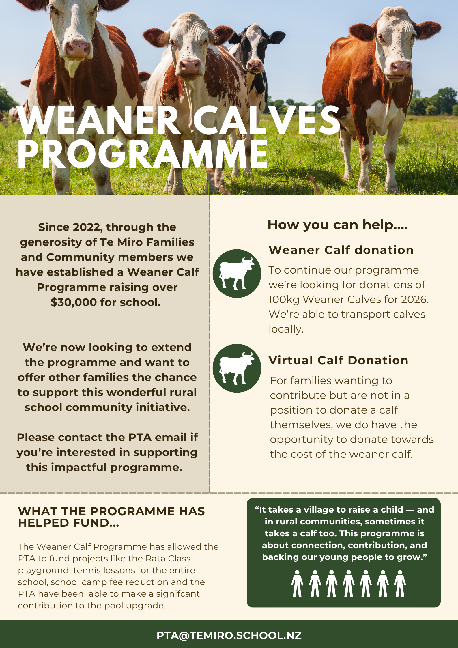 Te Miro is lucky to have a motivated and supportive PTA. They lead a number of annual initiatives that bring a continuous stream of funds into the school that help the students of Te Miro reach their potential. Some of the fund raising events organised by the PTA are Agricultural Day, Community Quiz, Golf Day, Student Disco, Movie Fundraisers and supporting various school events.